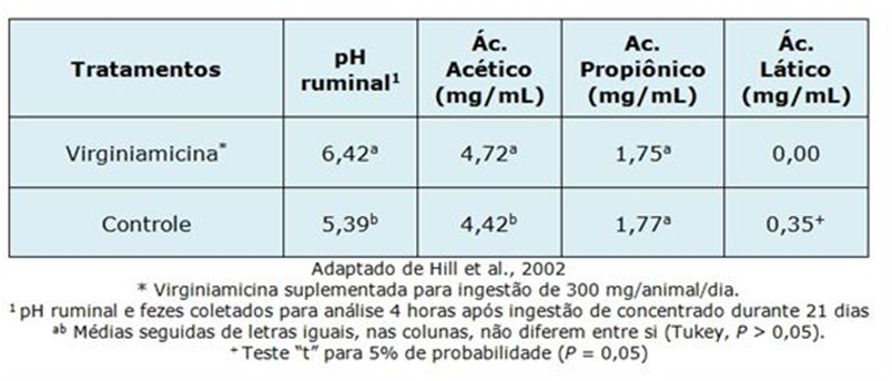 Pesquisadores do Paraná observaram maior pH ruminal em vacas de leite recebendo 8 kg de concentrado contendo virginiamicina. Nesse experimento, o maior pH ruminal foi resultado da inibição da produção de ácido lático do rúmen, com incremento de ácido acético (um dos precursores de gordura do leite) e sem alteração das concentrações de propionato (Tabela 5).
