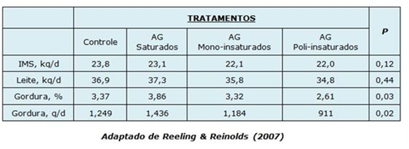 Figura 6. Efeito da adição de diferentes fontes de gorduras, de acordo com o grau de insaturação, em dietas de vacas de leite em lactação.