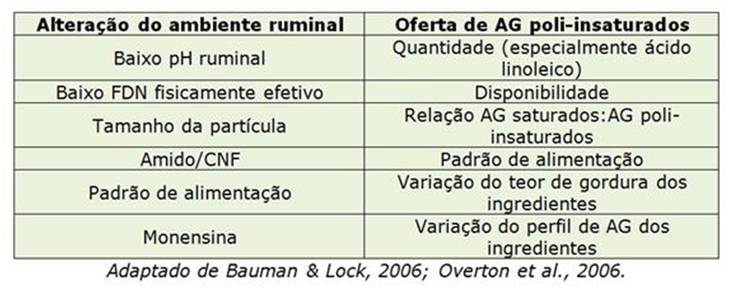 É importante lembrar que a extensão da biohidrogenação e a formação de ácidos graxos intermediários são determinadas pelas propriedades de cada fonte de gordura, tempo de retenção no rúmen e características da população microbiana. Fatores inerentes à dieta que modificam o padrão de fermentação ruminal, principalmente a alta concentração de amido, alta concentração de óleos e inclusão de monensina sódica alteram o metabolismo ruminal de ácidos graxos, resultando numa população microbiana que utiliza caminhos alternativos para biohidrogenação. Quando esses caminhos alternativos não se completam, o risco de DGL aumenta.