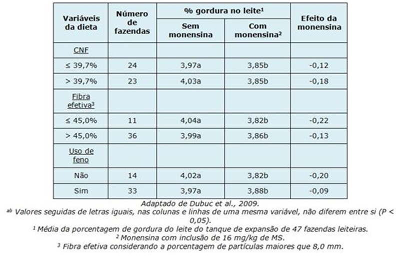 Resultados de um levantamento bastante interessante realizada por pesquisadores da Universidade de Montreal no Canadá são apresentados na Tabela 4. Nesse levantamento realizado em 47 propriedades leiteiras, identificou-se o efeito na suplementação de monensina de acordo com a concentração de CNF, tamanho de fibra efetiva e o uso de feno nas dietas dos animais. Independentemente do CNF, tamanho de partícula e feno, a monensina reduz expressivamente a concentração de gordura do tanque dessas propriedades, porém em rebanhos cuja dieta apresenta alto CNF, ou baixa fibra efetiva ou ausência de feno, a queda do ter de gordura do tanque é ainda maior.