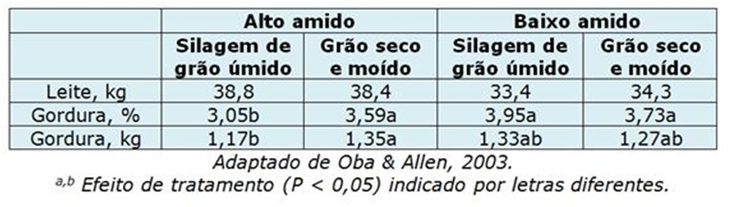 Animais que receberam dietas de baixo nível de amido não apresentaram diferenças no leite entre os tipos de processamento de grão de milho, porém no tratamento de alto amido, animais que receberam silagem de grão úmido de milho reduziram 15% da produção total de gordura do leite ou do teor de gordura em 0,54 pontos percentuais, quando comparados com o grupo de animais que receberam grão de milho seco e moído.