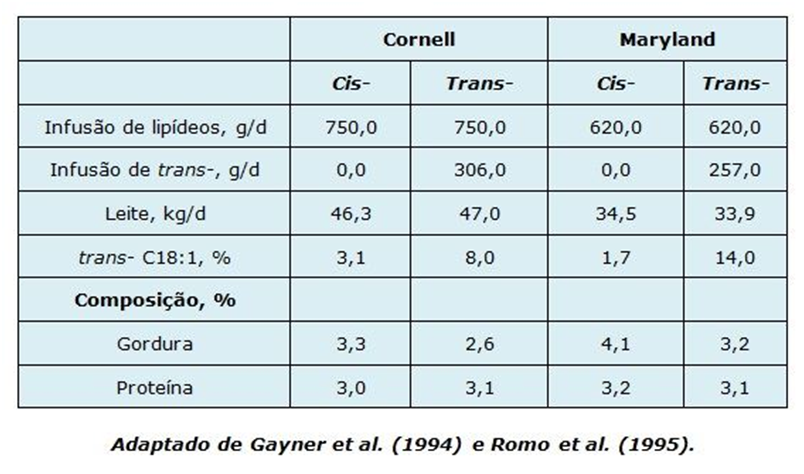 Pesquisadores das universidades de Cornell e Maryland observarem que a DGL está relacionada com a quantidade de ácidos graxos intermediários ou do tipo trans- sintetizados no rúmen, absorvidos pelo intestino delgado e incorporados pela glândula mamária na gordura do leite. Quando as concentrações de ácidos graxos trans- do leite aumentam, a concentração total de gordura do leite diminui (Figura 4). Observe que após a infusão de ácidos graxos do tipo trans-, o teor de gordura caiu de 3,3 para 2,6% e de 4,1 para 3,2% nos experimentos de Cornell e Maryland, respectivamente.