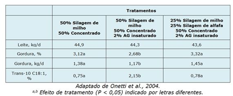 De acordo com os resultados, animais recebendo dietas com 50% de volumoso, sendo este 100% silagem de milho, e adição de 2% AG insaturados apresentaram menor produção total e concentração de gordura, uma vez que aumentaram a produção de trans-10 C18:1 na glândula mamária. Essa situação é revertida quando metade da silagem de milho é substituída por outra fonte de forragem, no caso do experimento alfafa.