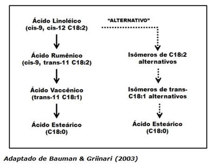Mesmo que, geralmente, dietas de ruminantes contenham baixa concentração de óleos e gorduras quando comparadas com as dietas de outras categorias animais, o fornecimento de alguns tipos de forragem, grãos, suplementos a base de óleos e outros subprodutos para vacas de leite podem resultar em significante ingestão de ácidos graxos poli-insaturados. Os ácidos graxos provenientes da dieta na sua maioria são esterificados na forma de triglicerídeos. Uma vez no rúmen, os ácidos graxos são hidrolisados e os ácidos graxos insaturados resultantes passam a ser isomerizados, quando ocorre mudança da posição da dupla ligação, e biohidrogenados, quando ocorre remoção da dupla ligação ou insaturação (Figura 2).